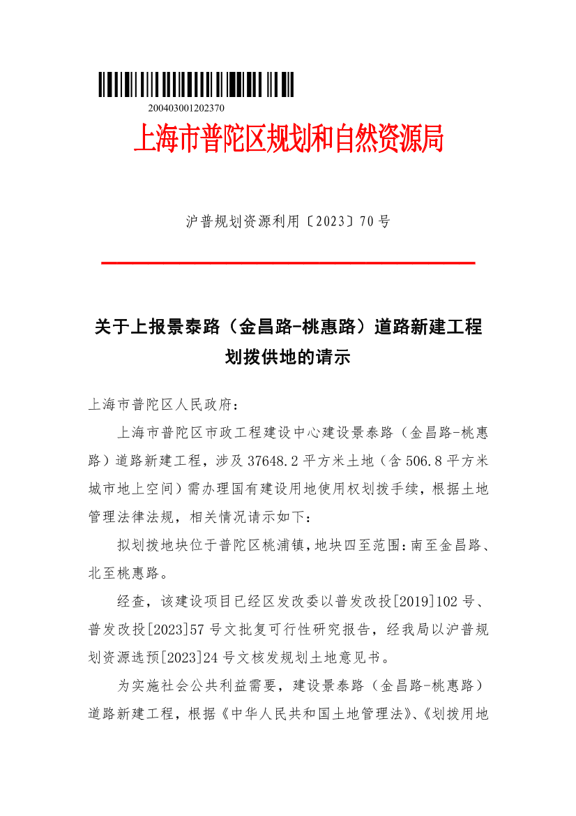上海市普陀区市政工程建设中心建设景泰路(金昌路-桃惠路)道路新建工程,涉及37648.2平方米土地(含506.8平方米城市地上空间)需办理国有建设用地使用权划拨手续,根据土地管理法律法规,相关情况请示如下: