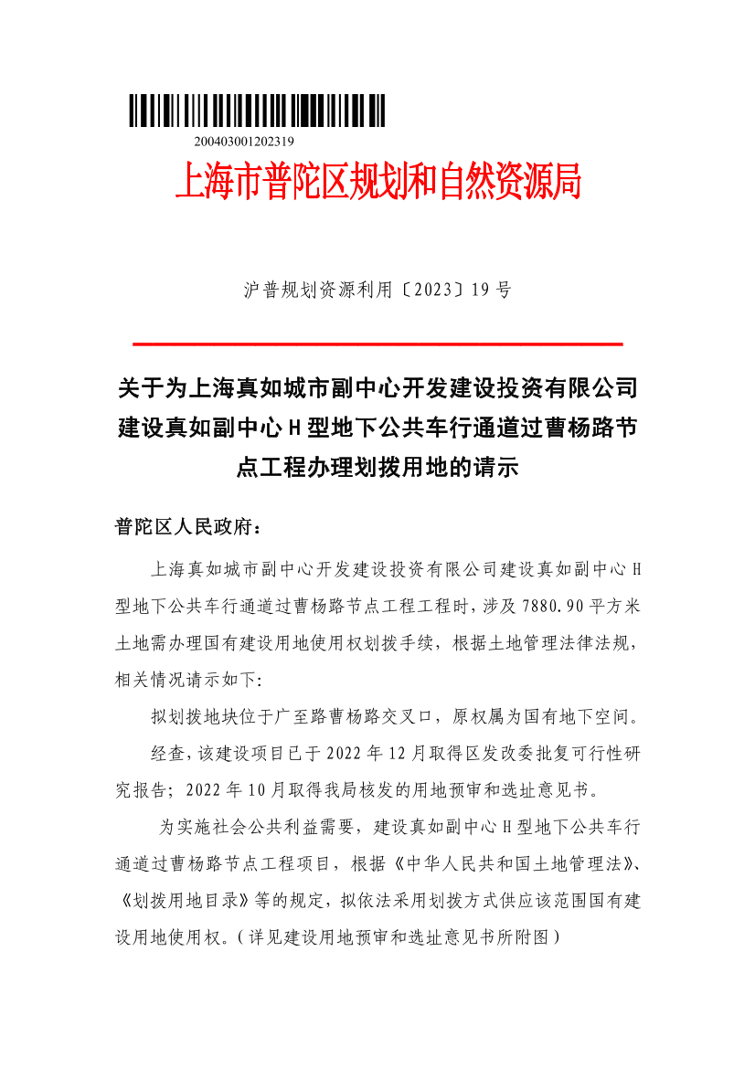 关于为上海真如城市副中心开发建设投资有限公司建设真如副中心H型地下公共车行通道过曹杨路节点工程办理划拨用地的请示