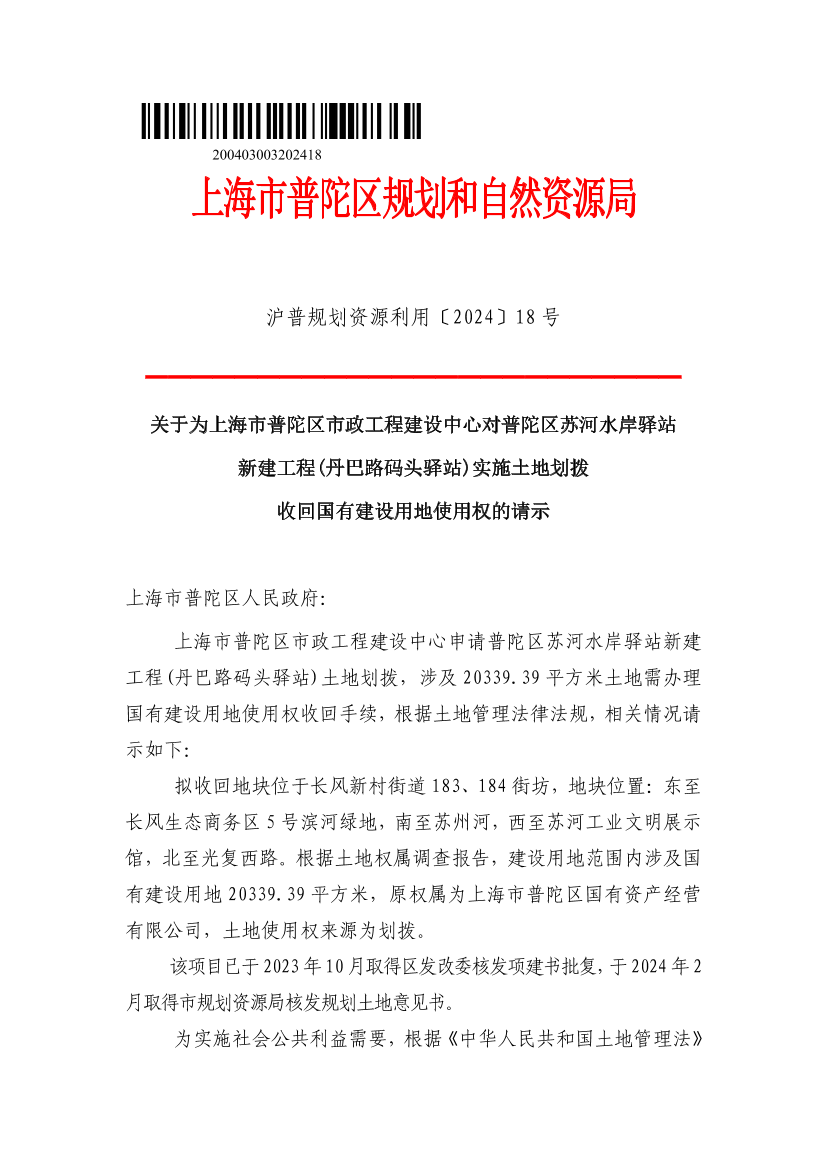 上海市普陀区市政工程建设中心申请普陀区苏河水岸驿站新建工程(丹巴路码头驿站)土地划拨,涉及20339.39平方米土地需办理国有建设用地使用权收回手续,根据土地管理法律法规,相关情况请示如下: