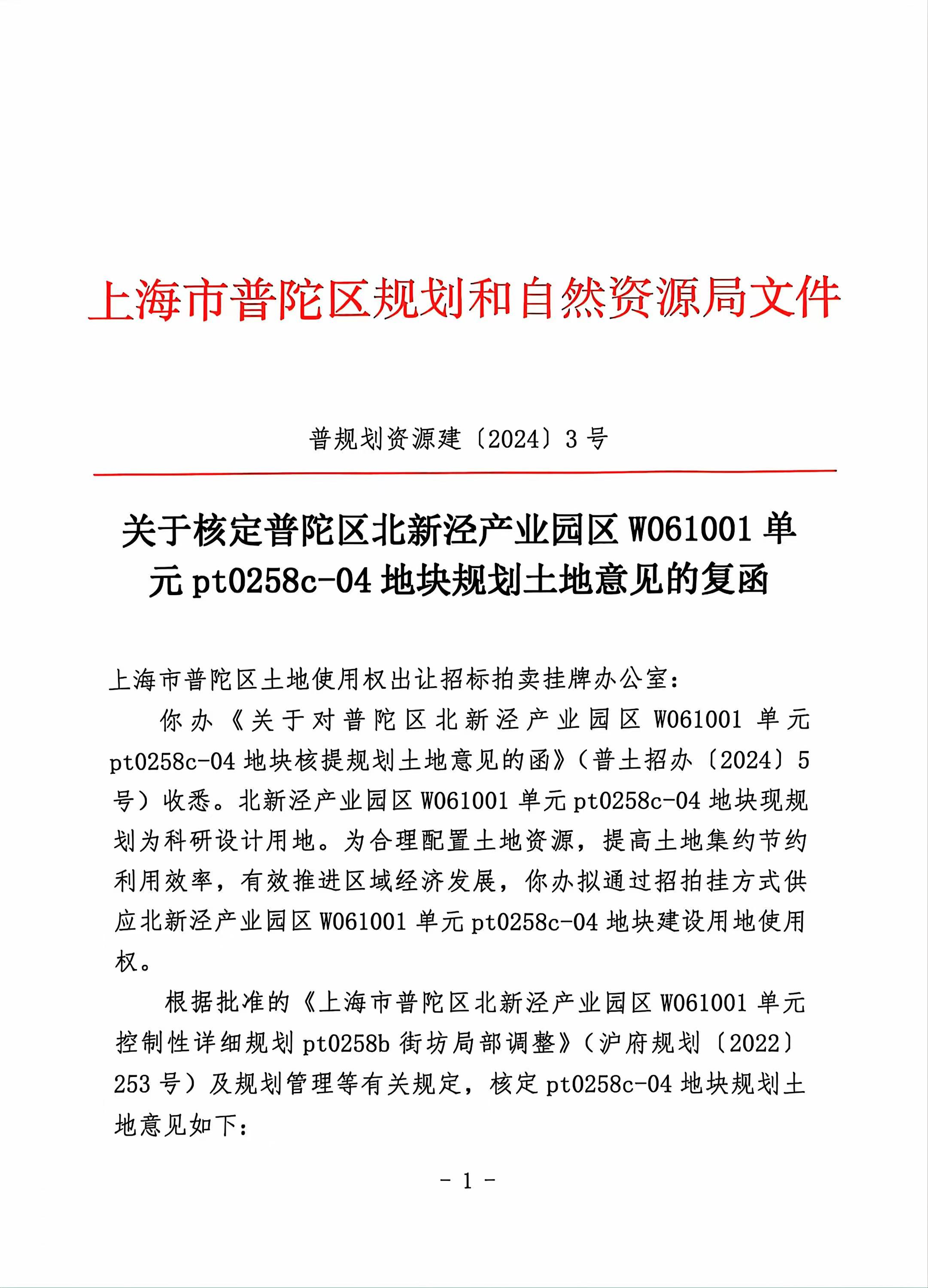 关于核定普陀区北新泾产业园区W061001单元pt0258c-04地块规划土地意见的复函