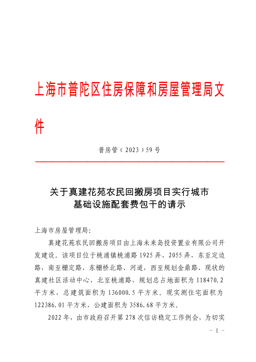 2022年,由市政府召开第278次信访稳定工作例会,为切实贯彻该例会的指示精神,尽早解决历史遗留问题,现该项目开发单位向我局提出配套费包干申请。我局经对其提交的资料进行审核,该项目相关水、电、燃气、电信、有线电视、市政道路等配套工程已由市所属配套单位组织实施,全部费用已实际支付,结合项目实际情况,拟参照槎浦新家园办证的方法和模式,申请真建花苑农民回搬房项目实行城市基础设施配套费包干建设。