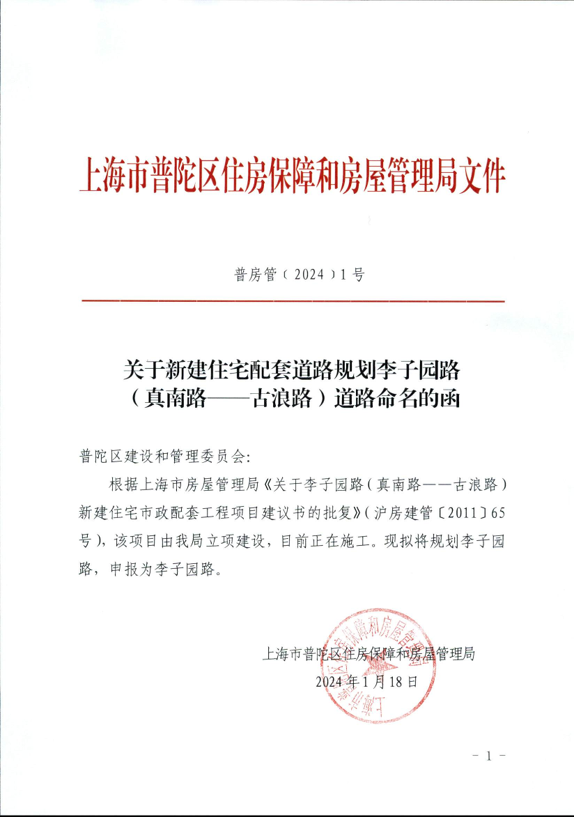 根据上海市房屋管理局《关于李子园路(真南路——古浪路)新建住宅市政配套工程项目建议书的批复》(沪房建管〔2011〕65号),该项目由我局立项建设,目前正在施工。现拟将规划李子园路,申报为李子园路。