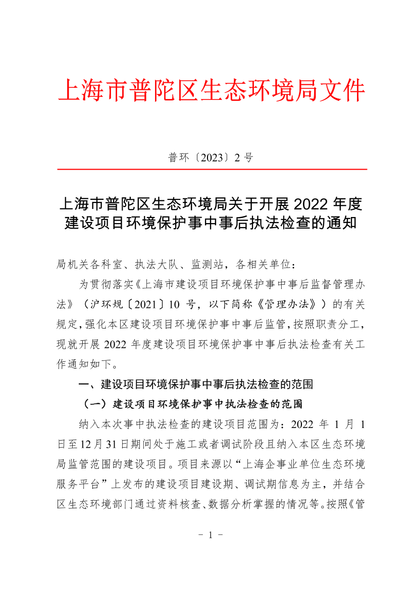 上海市普陀区生态环境局关于开展2022年度建设项目环境保护事中事后执法检查的通知