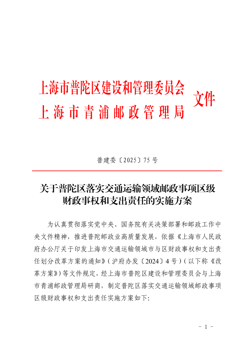 为认真贯彻落实党中央、国务院有关决策部署和邮政工作中央文件精神,推进普陀邮政业高质量发展,依据《上海市人民政府办公厅关于印发上海市交通运输领域市与区财政事权和支出责任划分改革方案的通知》(沪府办发〔2024〕4号)(以下称《改革方案》)等文件规定,经上海市普陀区建设和管理委员会与上海市青浦邮政管理局研商,制定普陀区落实交通运输领域邮政事项区级财政事权和支出责任实施方案如下: