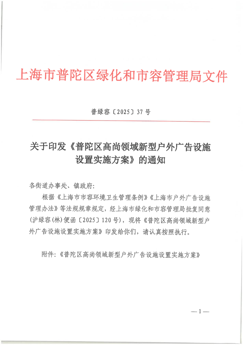 根据《上海市市容环境卫生管理条例》《上海市户外广告设施管理办法》等法规规章规定,经上海市绿化和市容管理局批复同意(沪绿容(林)便函〔2025〕120号),现将《普陀区高尚领域新型户外广告设施设置实施方案》印发给你们,请认真按照执行。