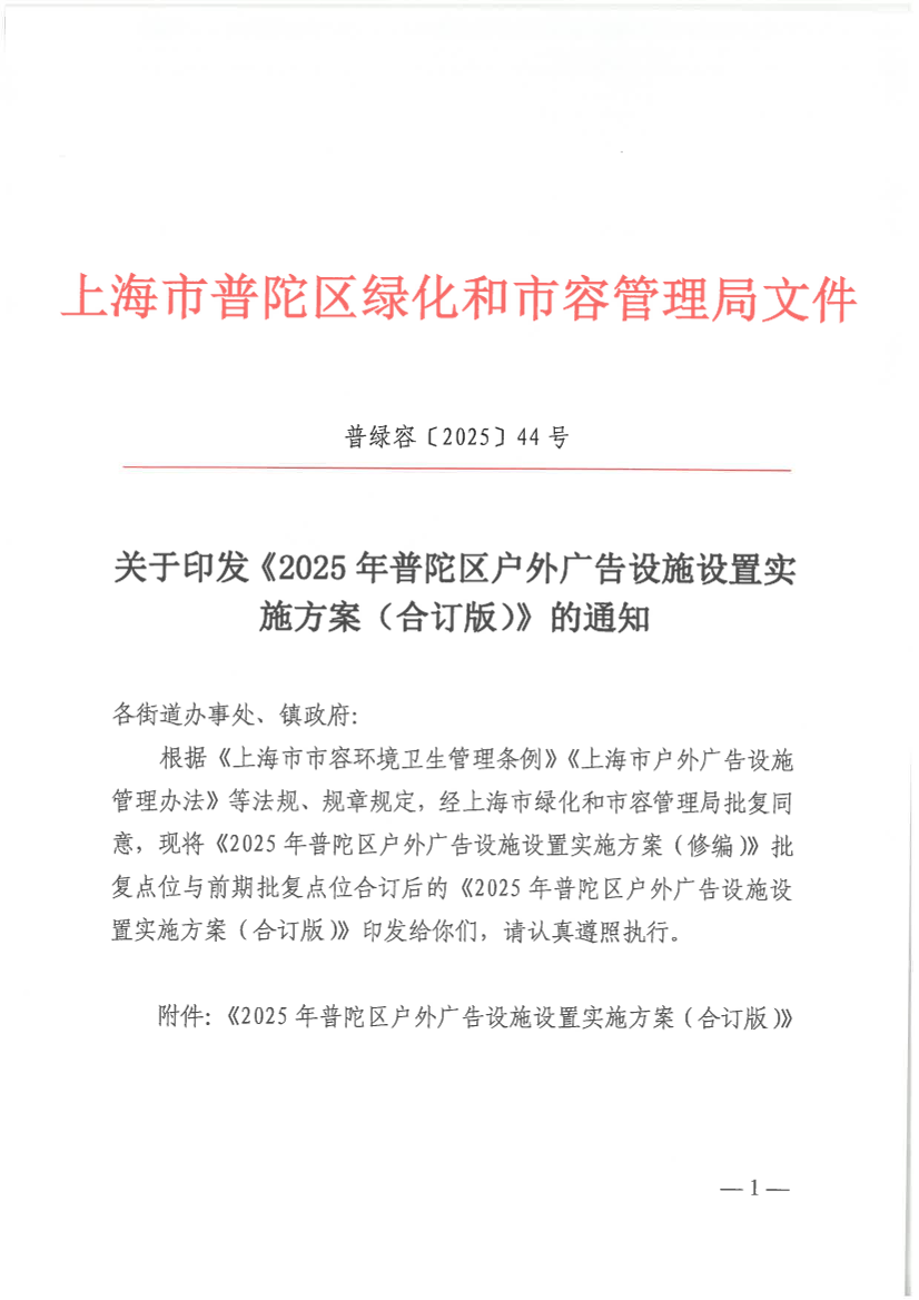 根据《上海市市容环境卫生管理条例》《上海市户外广告设施管理办法》等法规、规章规定,经上海市绿化和市容管理局批复同意,现将《2025年普陀区户外广告设施设置实施方案(修编)》批复点位与前期批复点位合订后的《2025年普陀区户外广告设施设置实施方案(合订版)》印发给你们,请认真遵照执行。