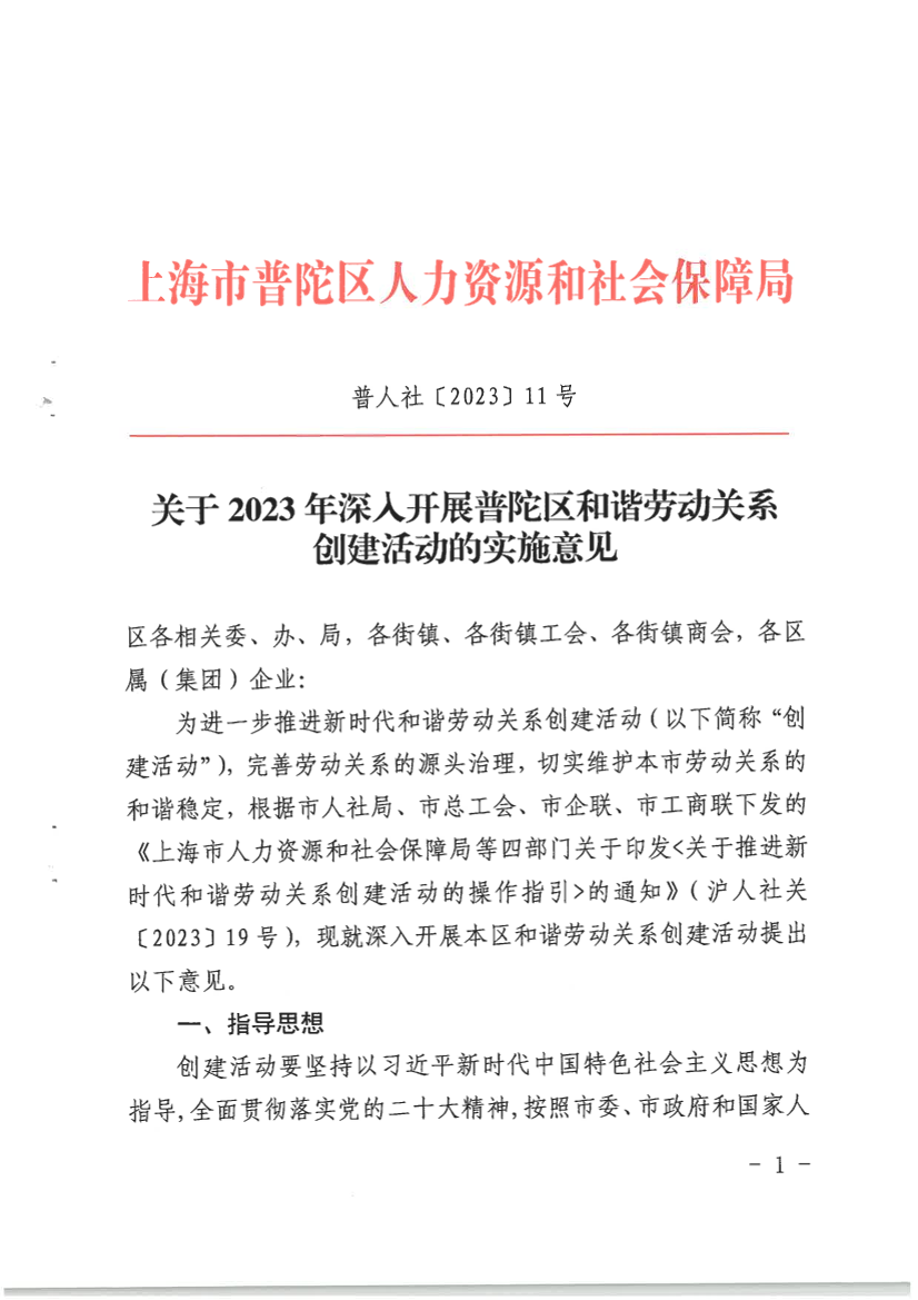 关于2023年深入开展普陀区和谐劳动关系创建活动的实施意见