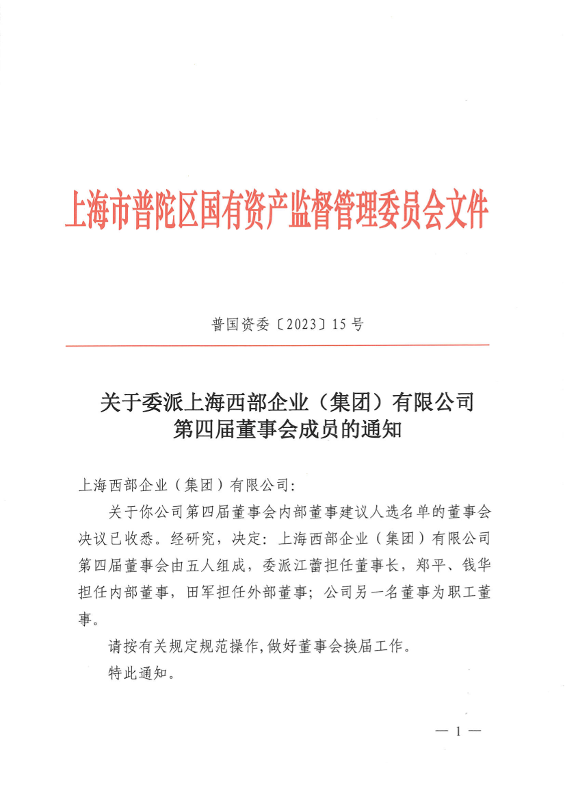 关于你公司第四届董事会内部董事建议人选名单的董事会决议已收悉。经研究,决定:上海西部企业(集团)有限公司第四届董事会由五人组成,委派江蕾担任董事长,郑平、钱华担任内部董事,田军担任外部董事;公司另一名董事为职工董事。