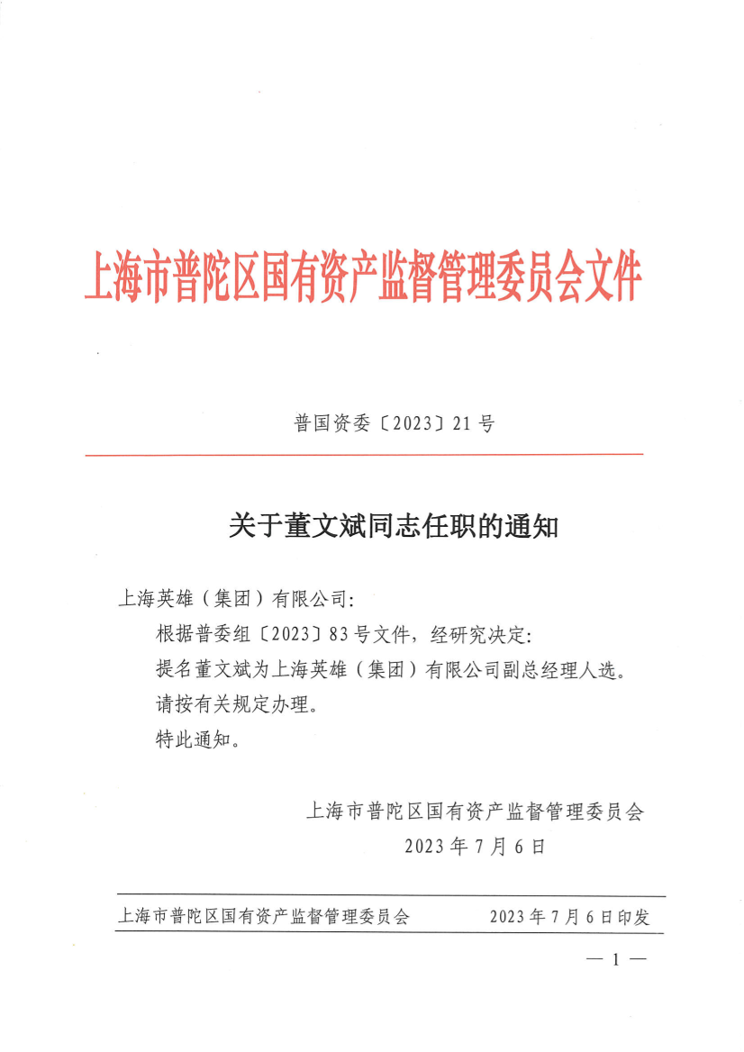 提名董文斌为上海英雄(集团)有限公司副总经理人选。