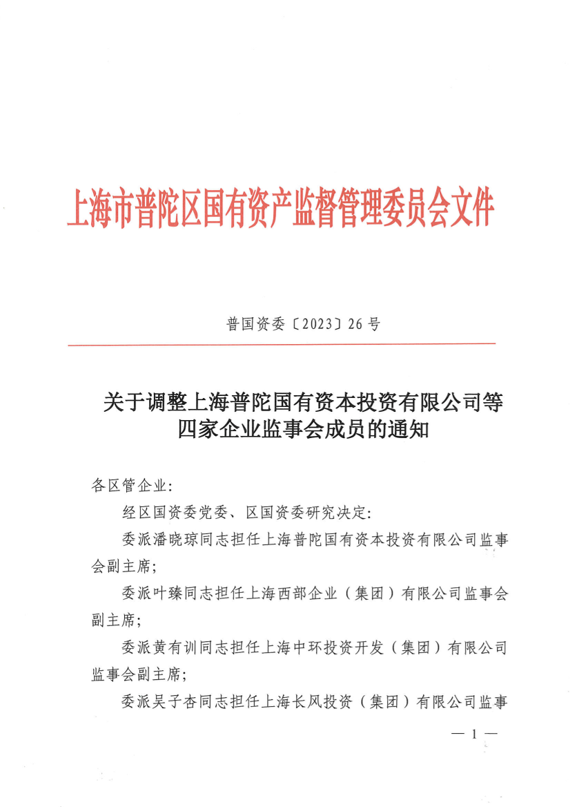 委派潘晓琼同志担任上海普陀国有资本投资有限公司监事会副主席;