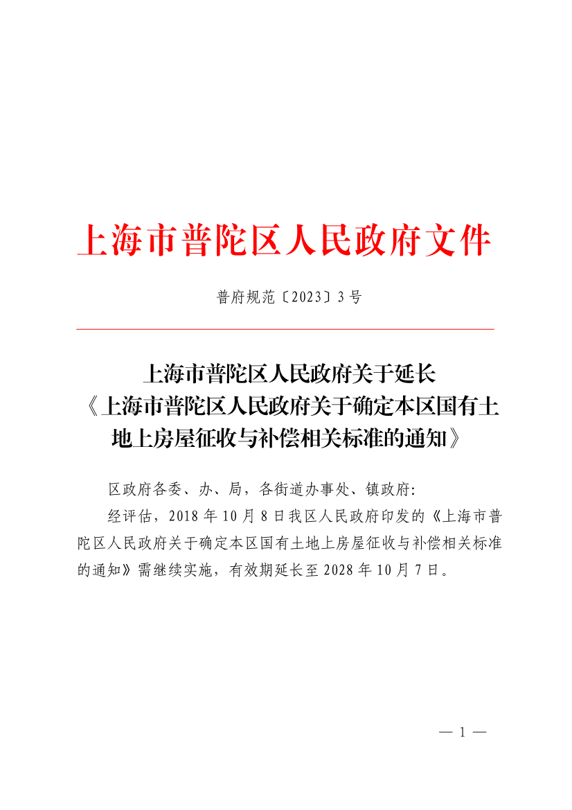 经评估,2018年10月8日我区人民政府印发的《上海市普陀区人民政府关于确定本区国有土地上房屋征收与补偿相关标准的通知》需继续实施,有效期延长至2028年10月7日。