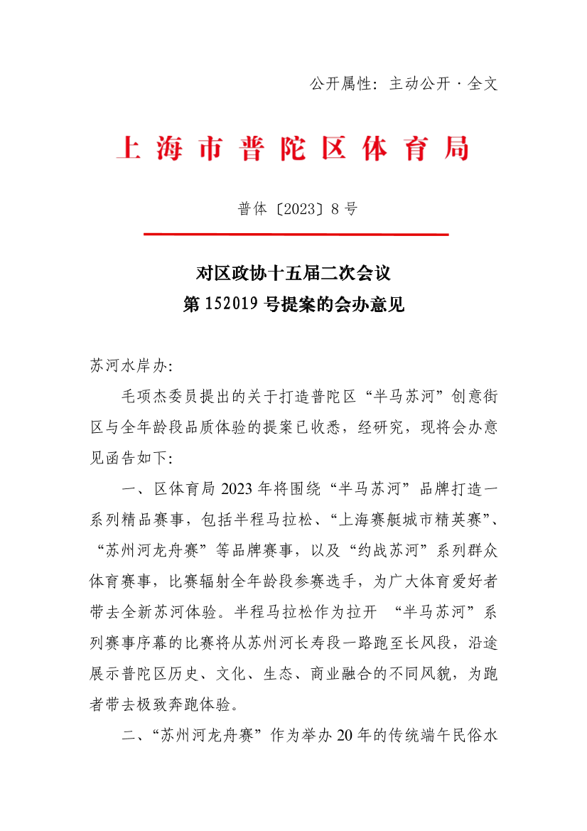 毛项杰委员提出的关于打造普陀区“半马苏河”创意街区与全年龄段品质体验的提案已收悉,经研究,现将会办意见函告如下: