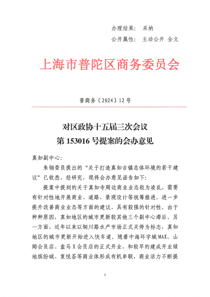 朱钢委员提出的“关于打造真如古镇总体环境的若干建议”已收悉,经研究,现将会办意见函告如下:
