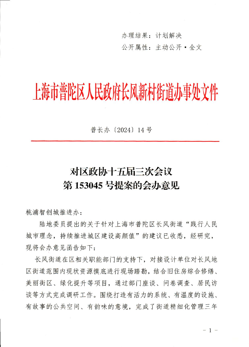 陆地委员提出的关于针对上海市普陀区长风街道“践行人民城市理念,持续推进城区建设高颜值”的建议已收悉,经研究,现将会办意见函告如下: