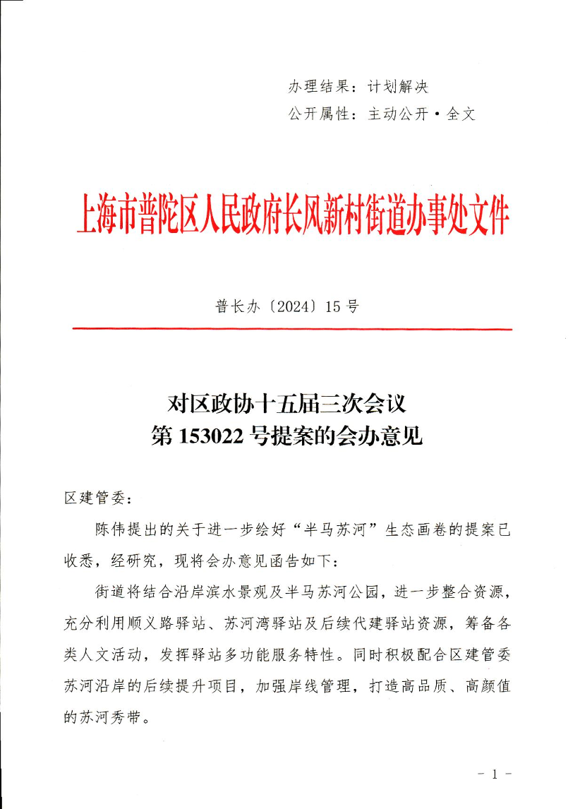陈伟提出的关于进一步绘好“半马苏河”生态画卷的提案已收悉,经研究,现将会办意见函告如下: