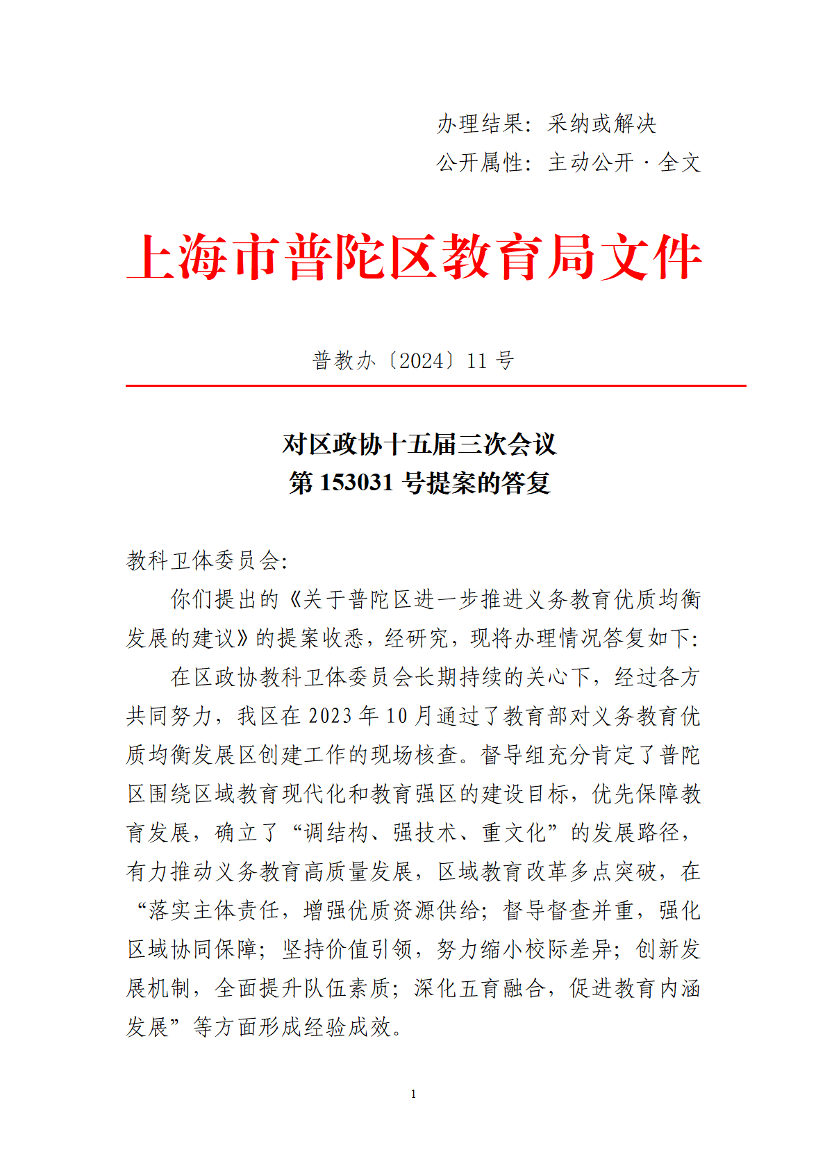 你们提出的《关于普陀区进一步推进义务教育优质均衡发展的建议》的提案收悉,经研究,现将办理情况答复如下: