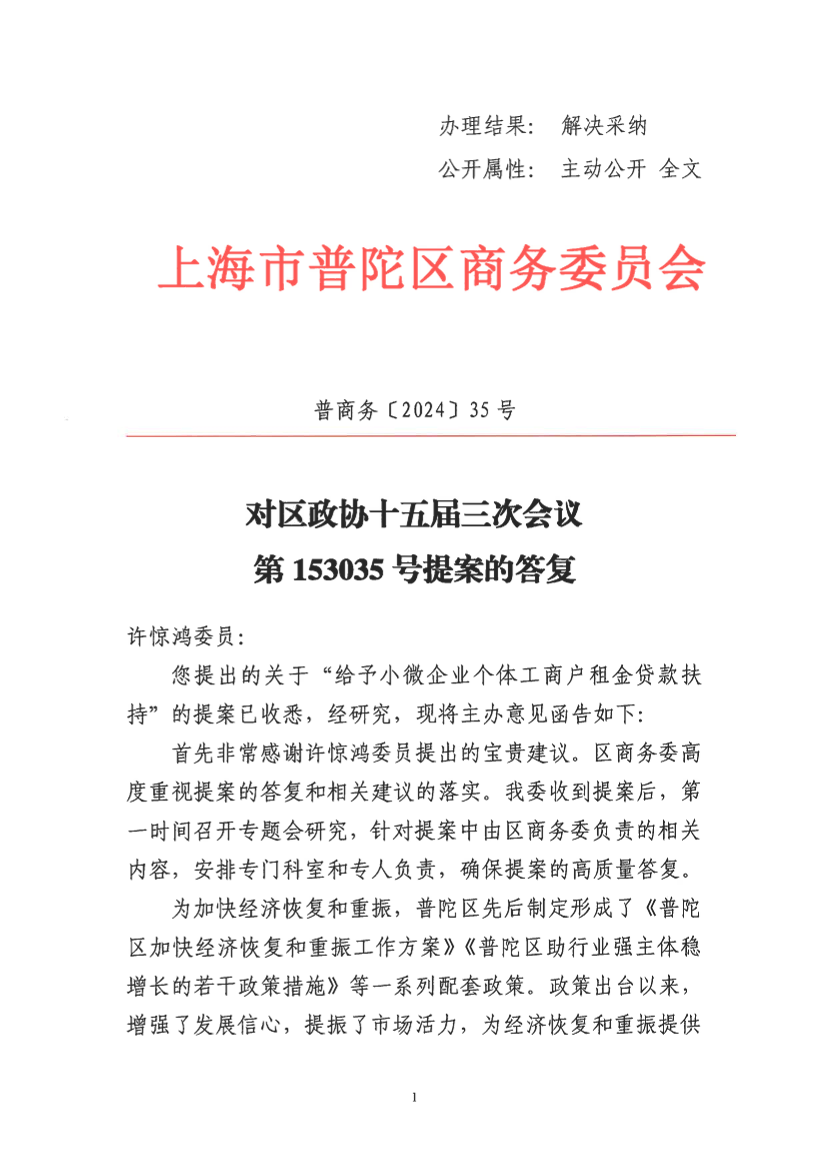 首先非常感谢许惊鸿委员提出的宝贵建议。区商务委高度重视提案的答复和相关建议的落实。我委收到提案后,第一时间召开专题会研究,针对提案中由区商务委负责的相关内容,安排专门科室和专人负责,确保提案的高质量答复。