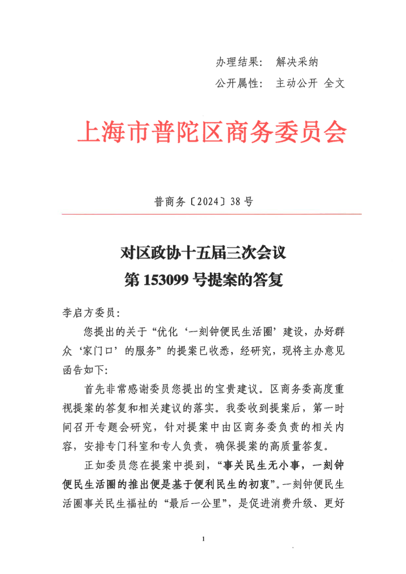 您提出的关于“优化‘一刻钟便民生活圈’建设,办好群众‘家门口’的服务”的提案已收悉,经研究,现将主办意见函告如下:
