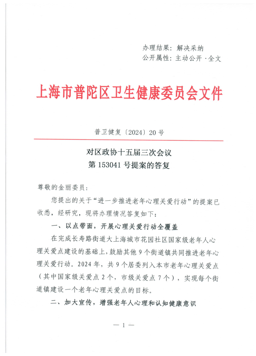 您提出的关于“进一步推进老年心理关爱行动”的提案已收悉,经研究,现将办理情况答复如下: