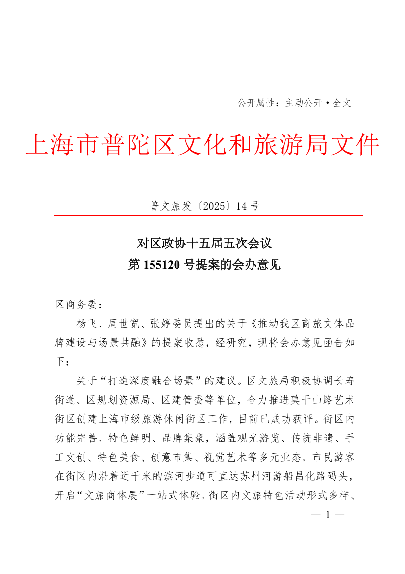 关于“打造深度融合场景”的建议。区文旅局积极协调长寿街道、区规划资源局、区建管委等单位,合力推进莫干山路艺术街区创建上海市级旅游休闲街区工作,目前已成功获评。街区内功能完善、特色鲜明、品牌集聚,涵盖观光游览、传统非遗、手工文创、特色美食、创意市集、视觉艺术等多元业态,市民游客在街区内沿着近千米的滨河步道可直达苏州河游船昌化路码头,开启“文旅商体展”一站式体验。街区内文旅特色活动形式多样、内容丰富,有“半马苏河”文化旅游节、苏州河半程马拉松赛、M50当代艺术周、千树艺术市集、苏州河沿岸市集等一批颇具影响力的特色化、主题化、常态化活动。此前,莫干山路艺术街区已入选国家级夜间文化和旅游消费集聚区。区文旅局将借助莫干山路艺术街区的辐射带动作用,打造更具特色和人气的文旅商体展融合业态,持续构建“游船+”“演艺+”“展览+”等更多文旅消费场景。