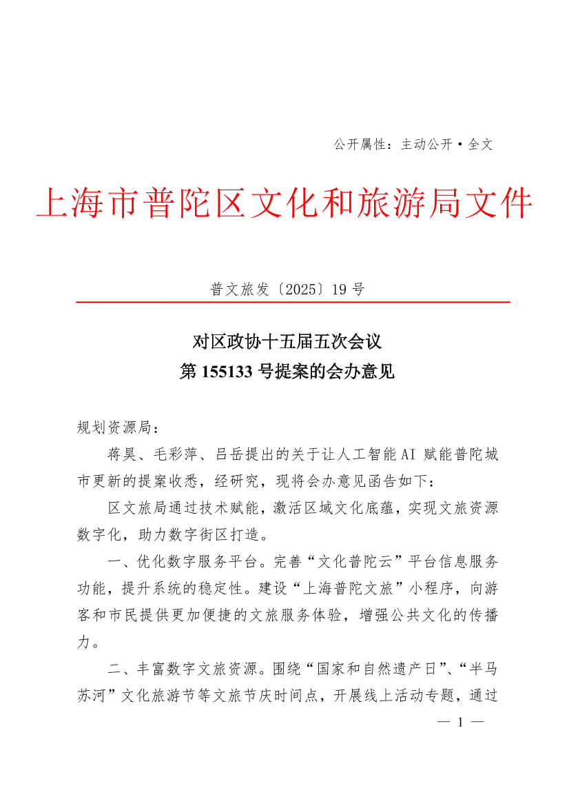 蒋昊、毛彩萍、吕岳提出的关于让人工智能AI 赋能普陀城市更新的提案收悉,经研究,现将会办意见函告如下: