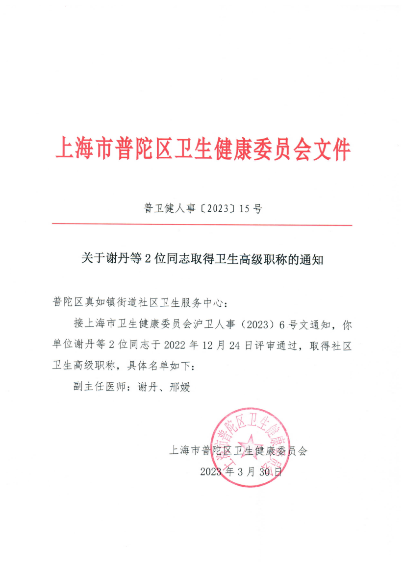 接上海市卫生健康委员会沪卫人事(2023)6号文通知,你单位谢丹等2位同志于2022年12月24日评审通过,取得社区卫生高级职称,具体名单如下: