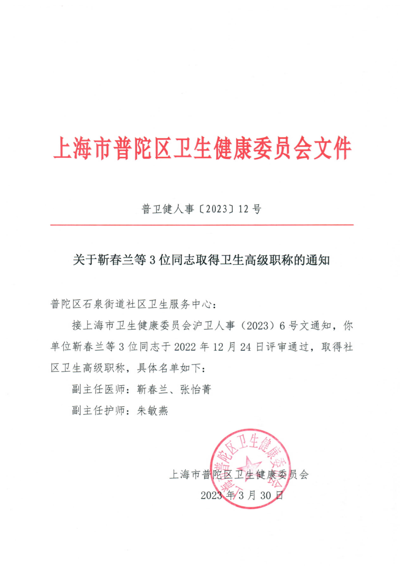 接上海市卫生健康委员会沪卫人事(2023)6号文通知,你单位靳春兰等3位同志于2022年12月24日评审通过,取得社区卫生高级职称,具体名单如下: