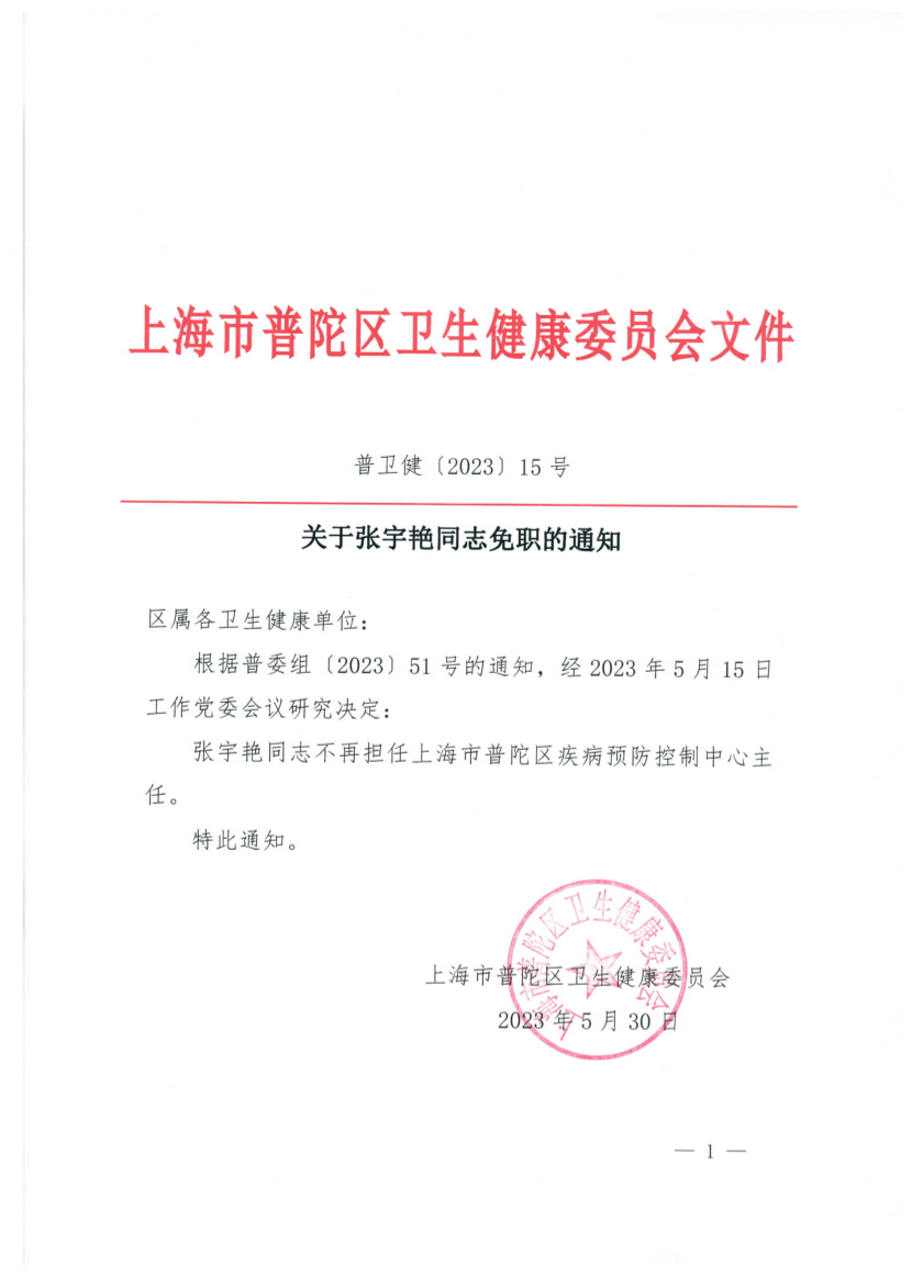 张宇艳同志不再担任上海市普陀区疾病预防控制中心主任。