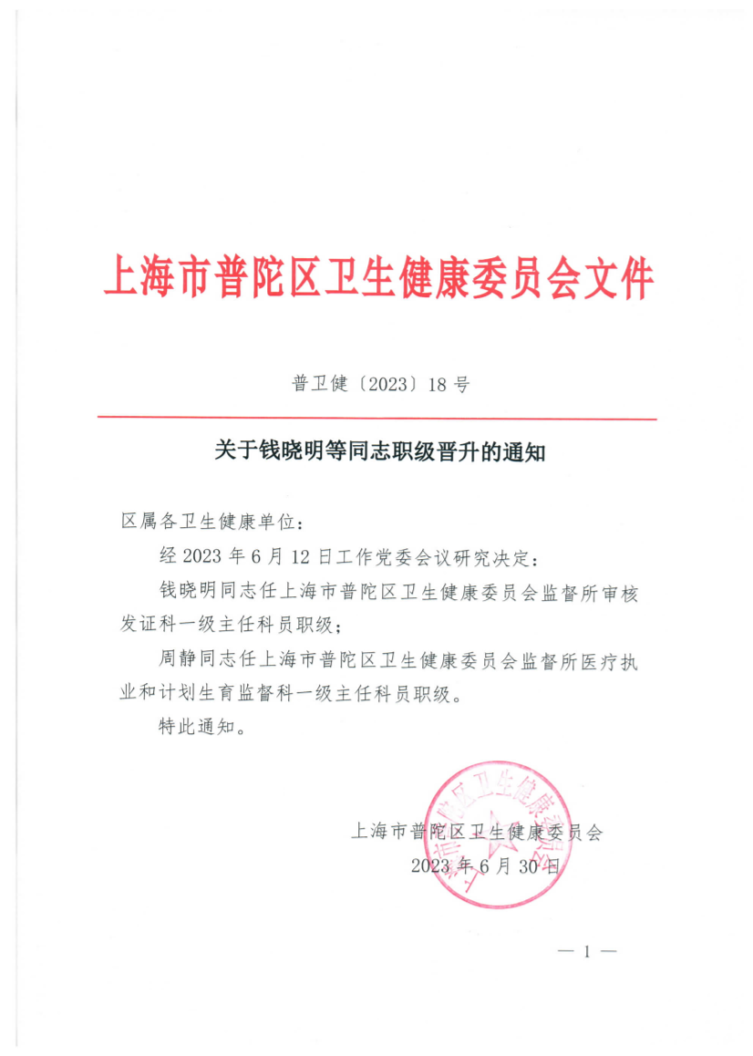钱晓明同志任上海市普陀区卫生健康委员会监督所审核发证科一级主任科员职级;