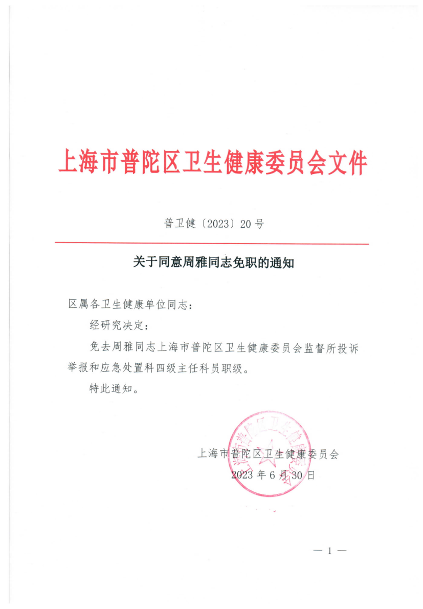 免去周雅同志上海市普陀区卫生健康委员会监督所投诉举报和应急处置科四级主任科员职级。
