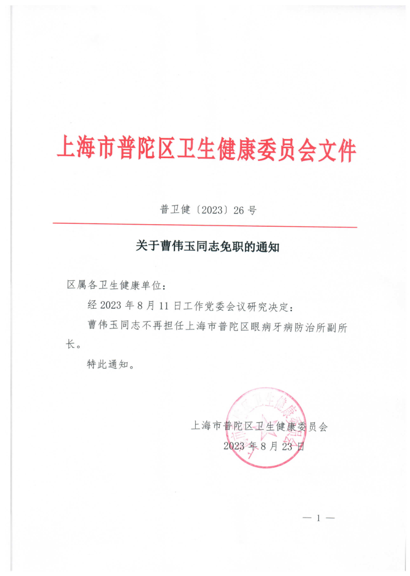 曹伟玉同志不再担任上海市普陀区眼病牙病防治所副所长。