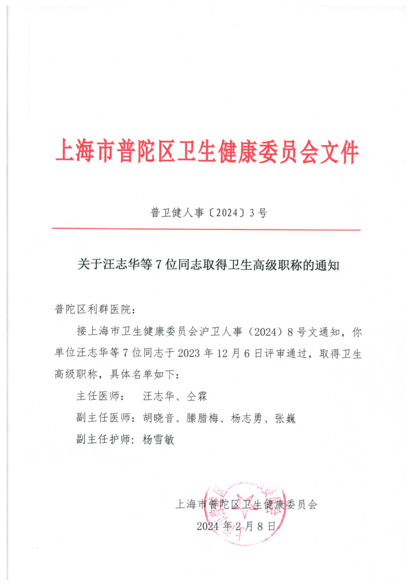 接上海市卫生健康委员会沪卫人事(2024)8号文通知,你单位汪志华等7位同志于2023年12月6日评审通过,取得卫生高级职称,具体名单如下: