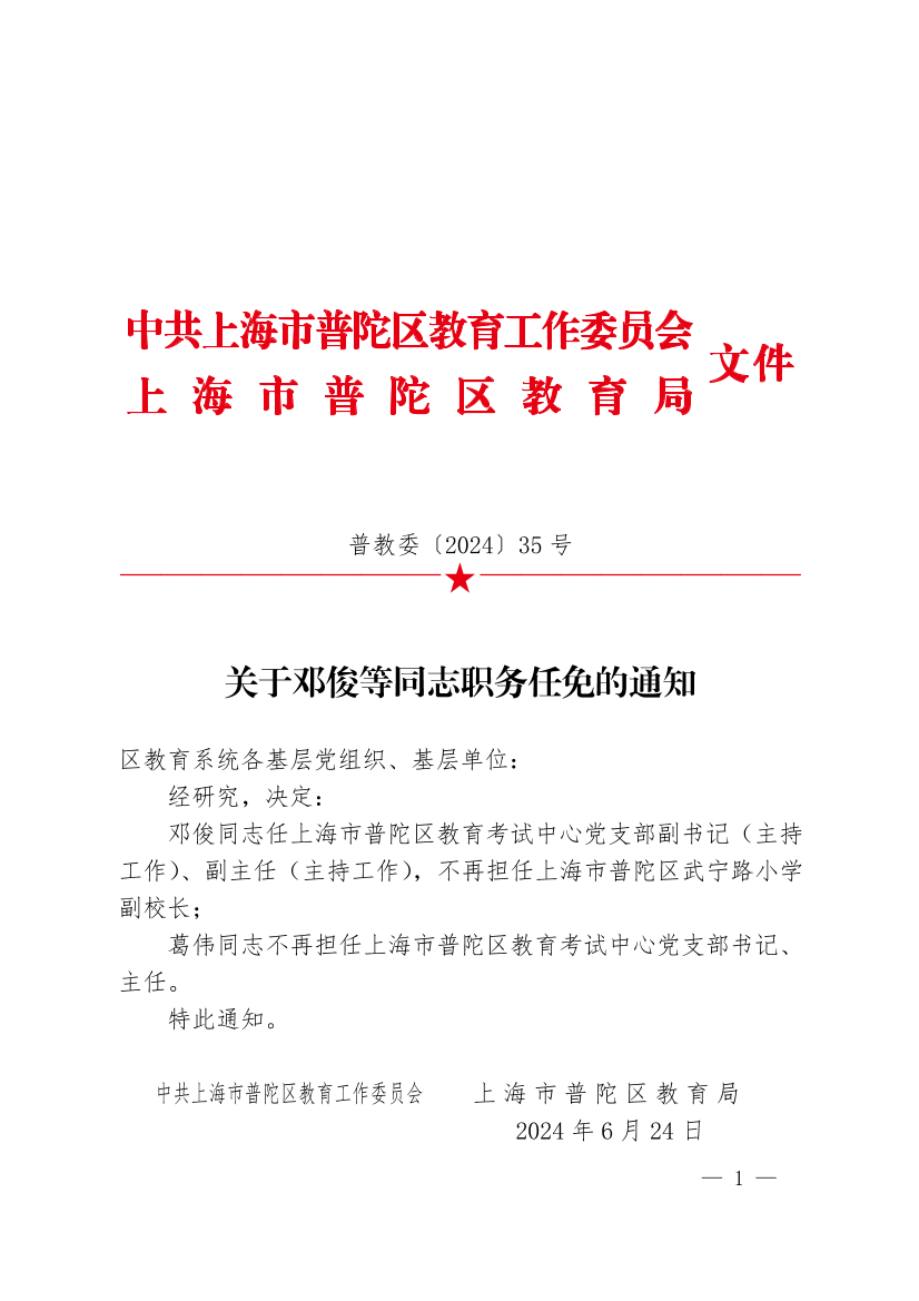 邓俊同志任上海市普陀区教育考试中心党支部副书记(主持工作)、副主任(主持工作),不再担任上海市普陀区武宁路小学副校长;