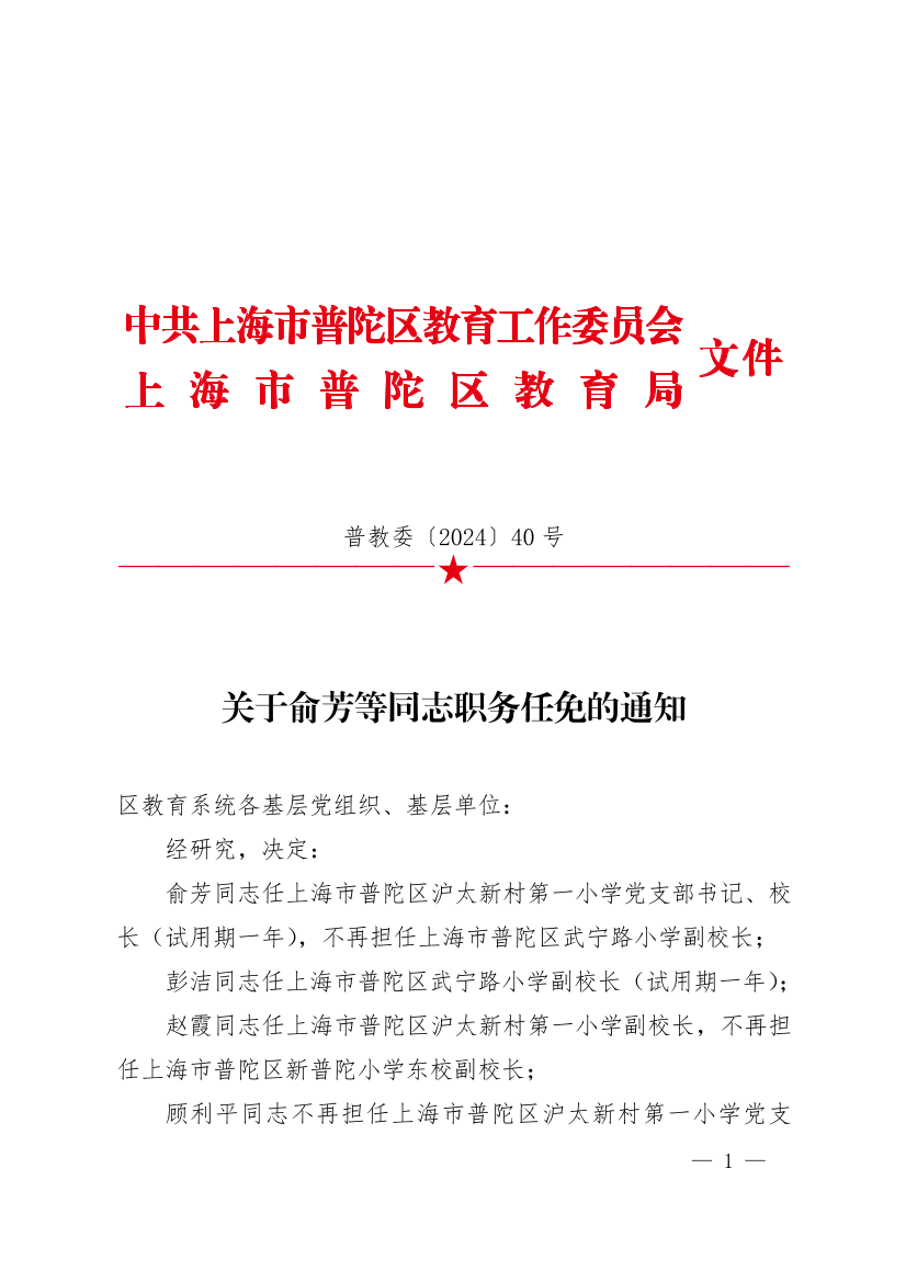 俞芳同志任上海市普陀区沪太新村第一小学党支部书记、校长(试用期一年),不再担任上海市普陀区武宁路小学副校长;