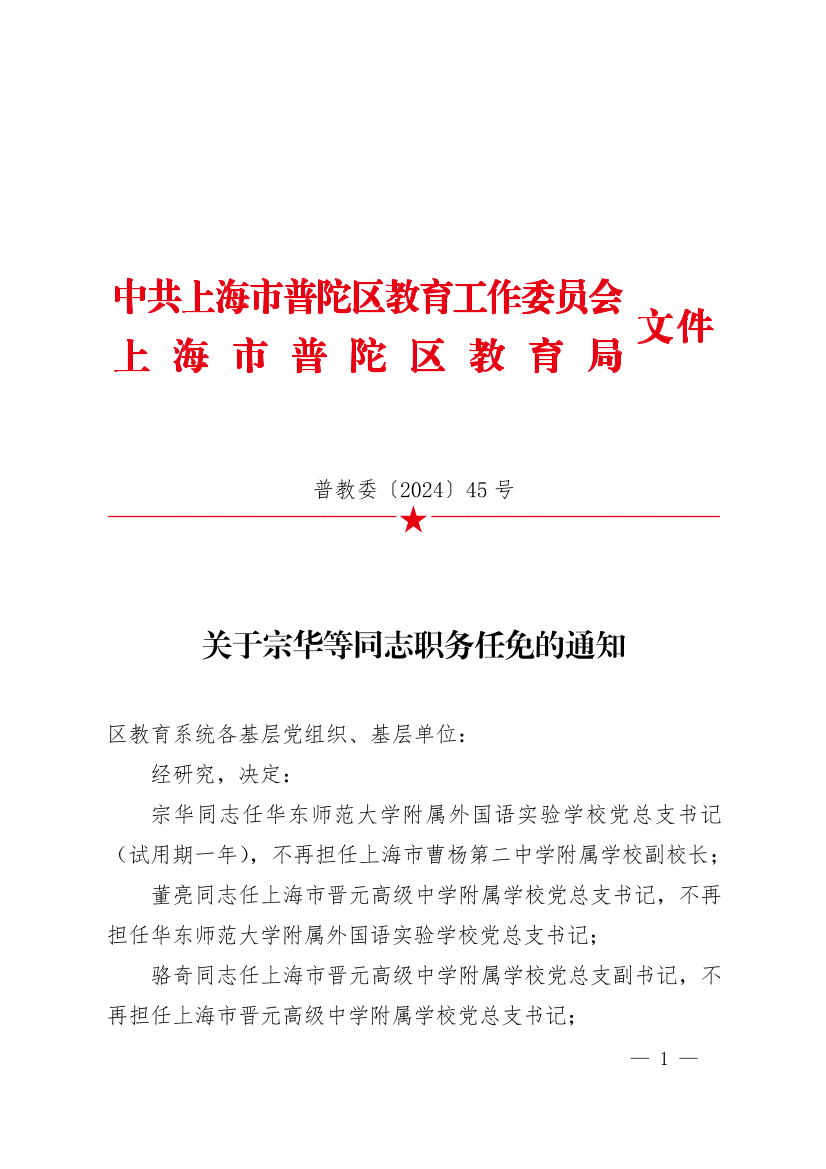 宗华同志任华东师范大学附属外国语实验学校党总支书记(试用期一年),不再担任上海市曹杨第二中学附属学校副校长;