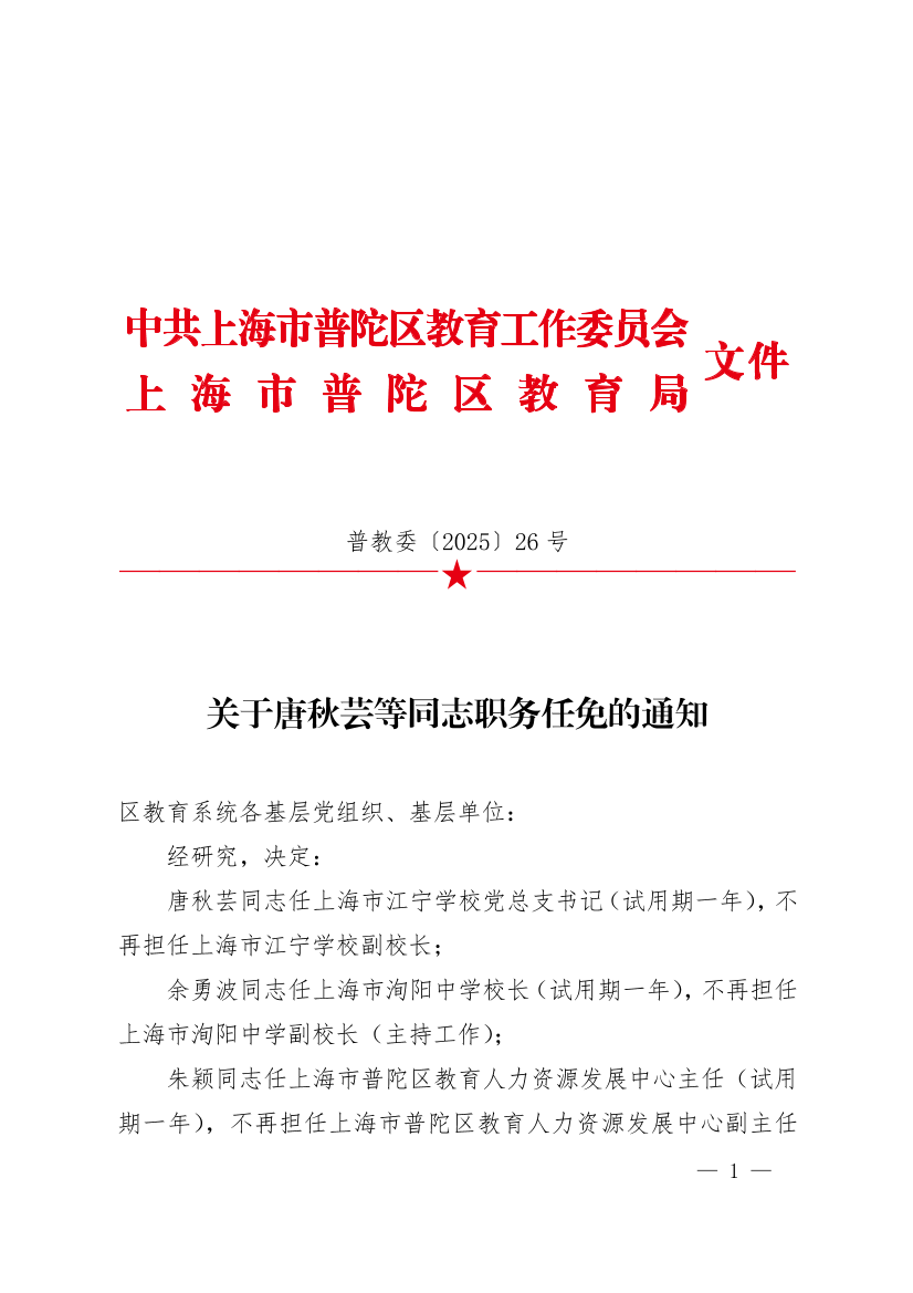 唐秋芸同志任上海市江宁学校党总支书记(试用期一年),不再担任上海市江宁学校副校长;