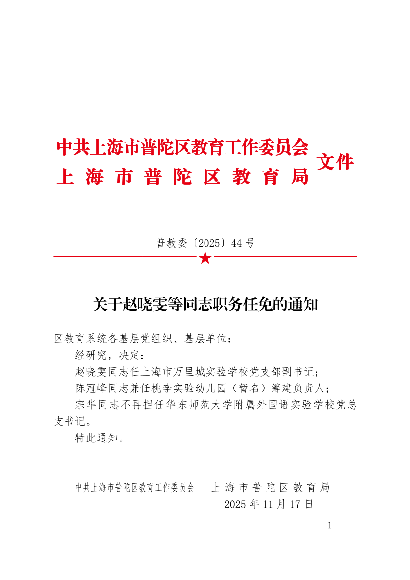 赵晓雯同志任上海市万里城实验学校党支部副书记;