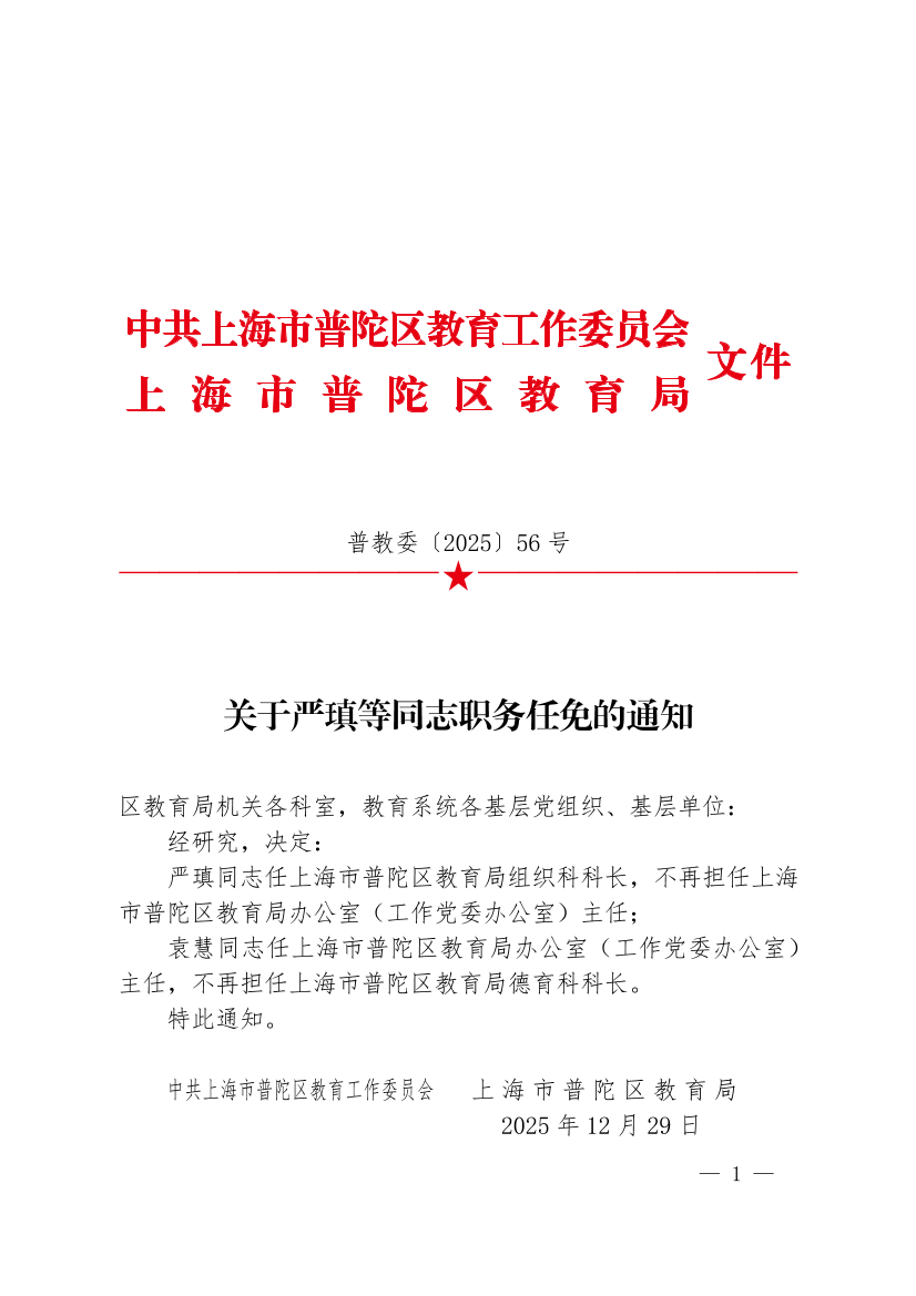 严瑱同志任上海市普陀区教育局组织科科长,不再担任上海市普陀区教育局办公室(工作党委办公室)主任;