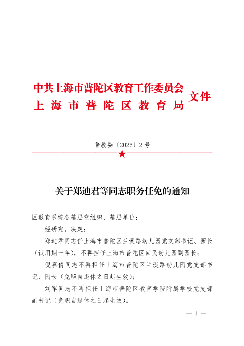 郑迪君同志任上海市普陀区兰溪路幼儿园党支部书记、园长(试用期一年),不再担任上海市普陀区回民幼儿园副园长;