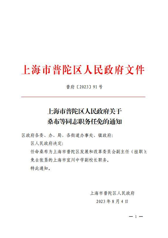 任命桑布为上海市普陀区发展和改革委员会副主任(挂职);
