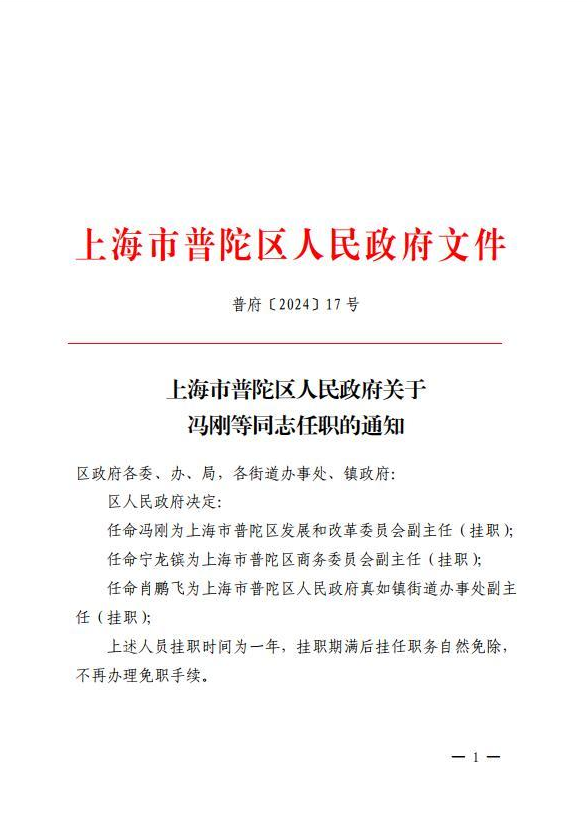 上海市普陀区人民政府关于冯刚等同志任职的通知