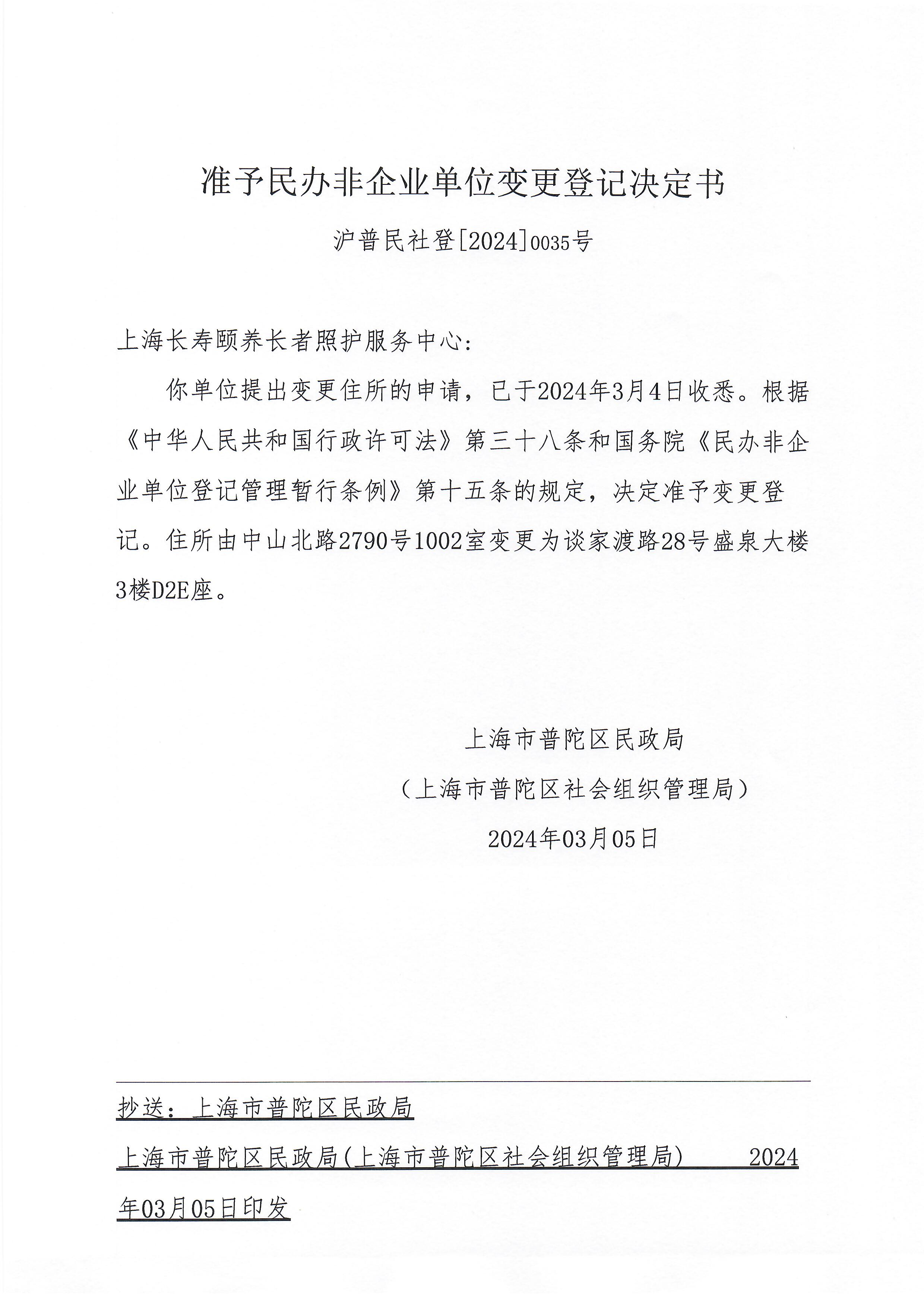 你单位提出变更住所的申请,已于2024年3月4日收悉。根据《中华人民共和国行政许可法》第三十八条和国务院《民办非企业单位登记管理暂行条例》第十五条的规定,决定准予变更登记。住所由中山北路2790号1002室变更为谈家渡路28号盛泉大楼3楼D2E座。