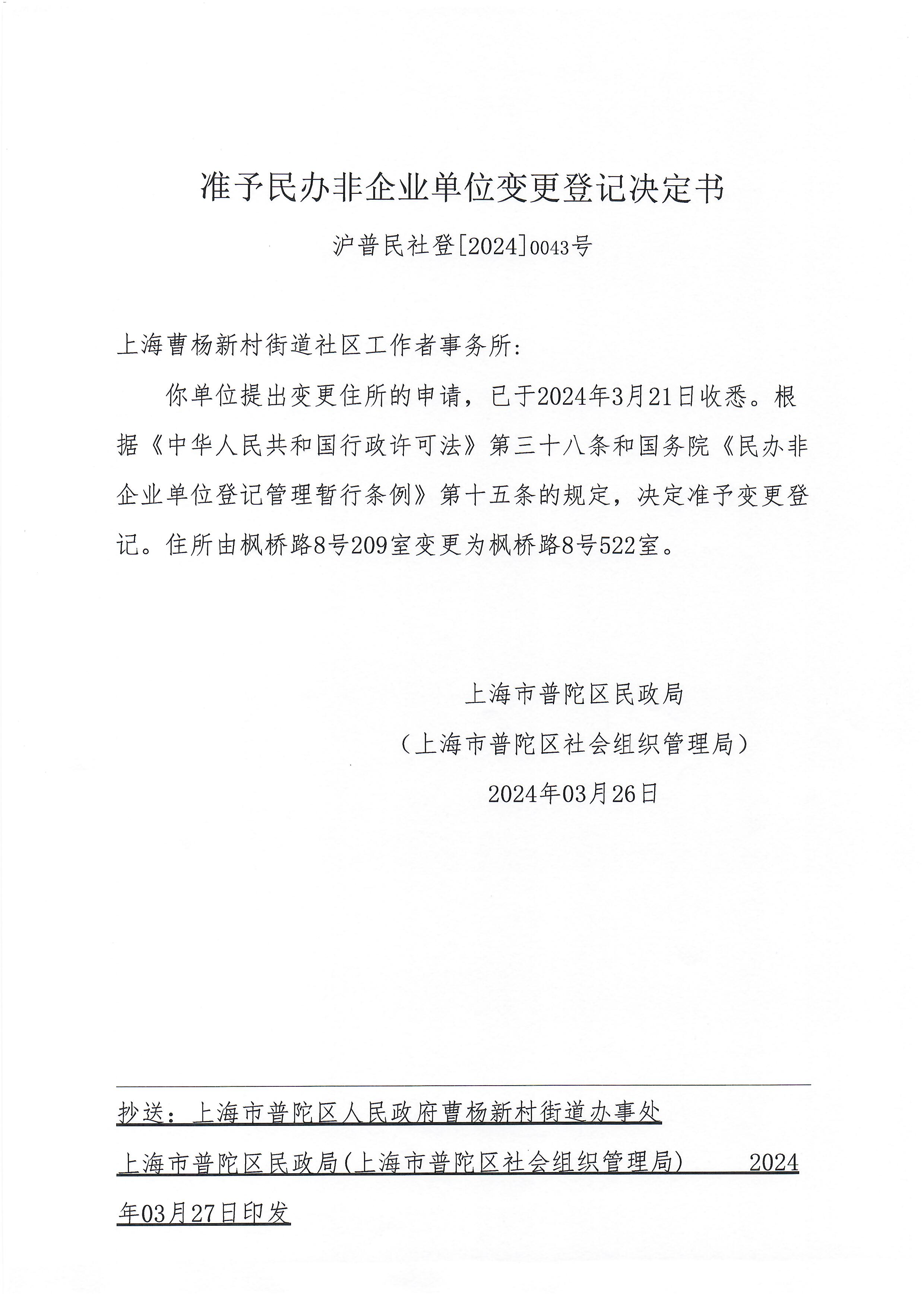 你单位提出变更住所的申请,已于2024年3月21日收悉。根据《中华人民共和国行政许可法》第三十八条和国务院《民办非企业单位登记管理暂行条例》第十五条的规定,决定准予变更登记。住所由枫桥路8号209室变更为枫桥路8号522室。