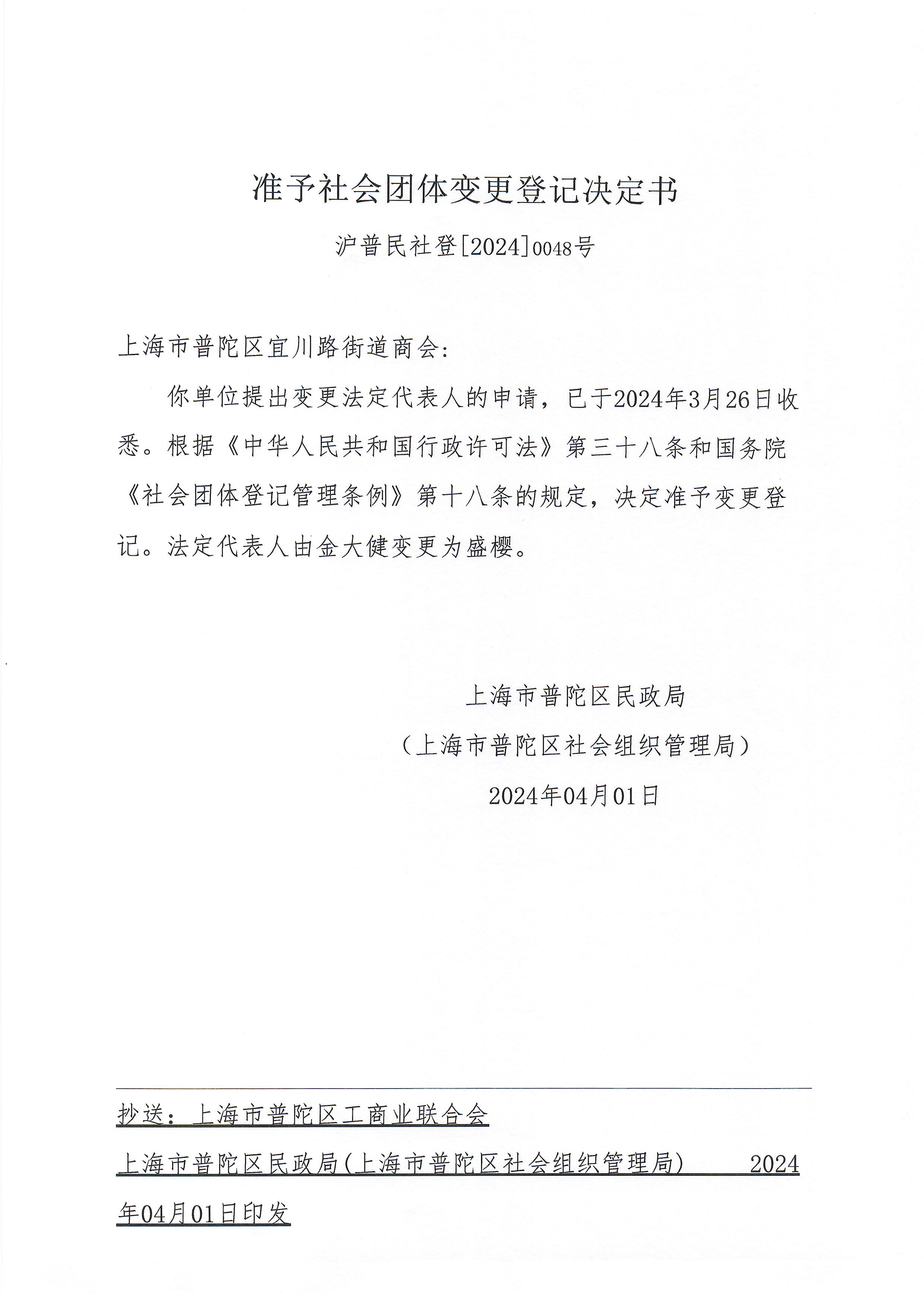 你单位提出变更法定代表人的申请,已于2024年3月26日收悉。根据《中华人民共和国行政许可法》第三十八条和国务院《社会团体登记管理条例》第十八条的规定,决定准予变更登记。法定代表人由金大健变更为盛樱。