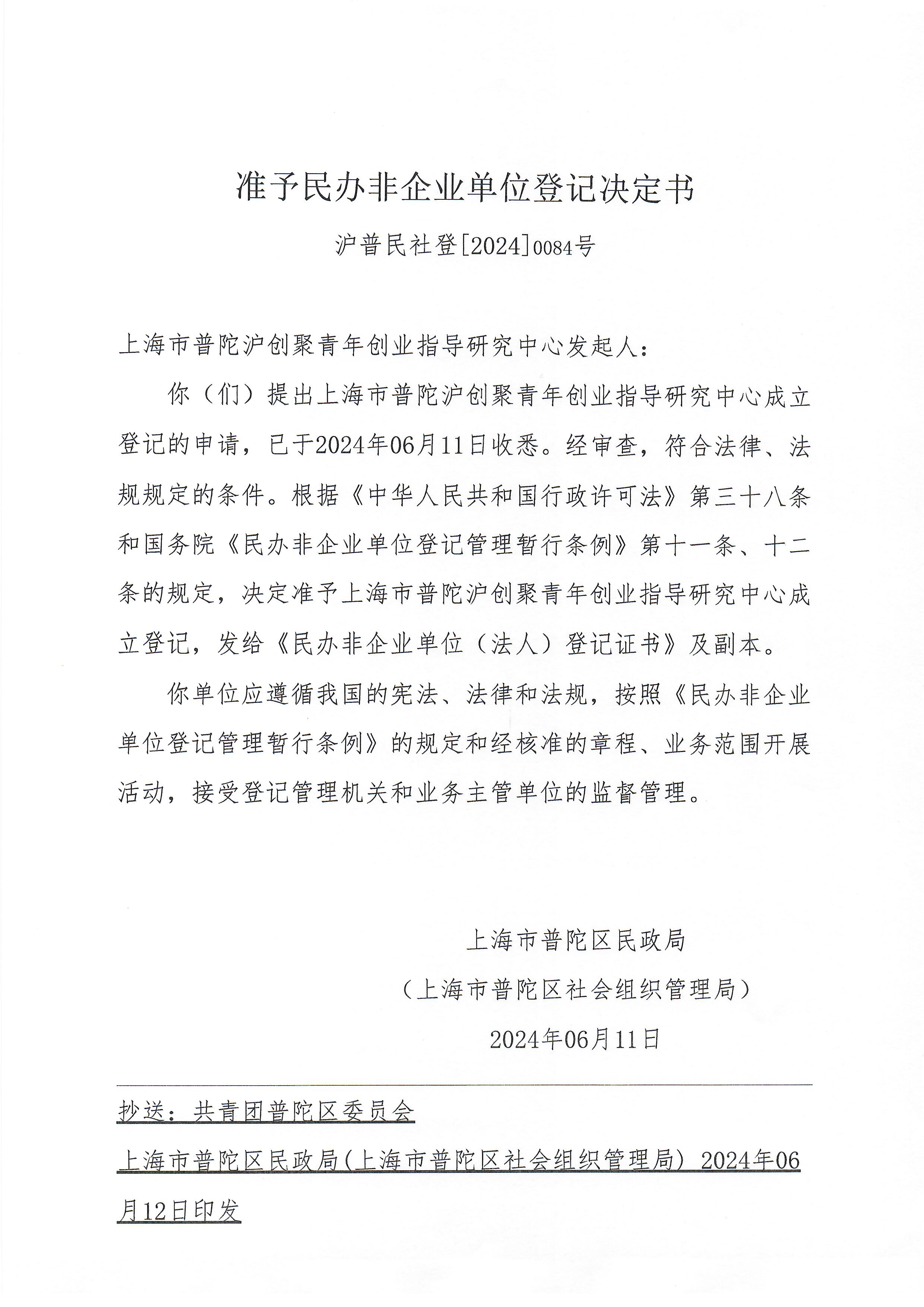 你(们)提出上海市普陀沪创聚青年创业指导研究中心成立登记的申请,已于2024年06月11日收悉。经审查,符合法律、法规规定的条件。根据《中华人民共和国行政许可法》第三十八条和国务院《民办非企业单位登记管理暂行条例》第十一条、十二条的规定,决定准予上海市普陀沪创聚青年创业指导研究中心成立登记,发给《民办非企业单位(法人)登记证书》及副本。