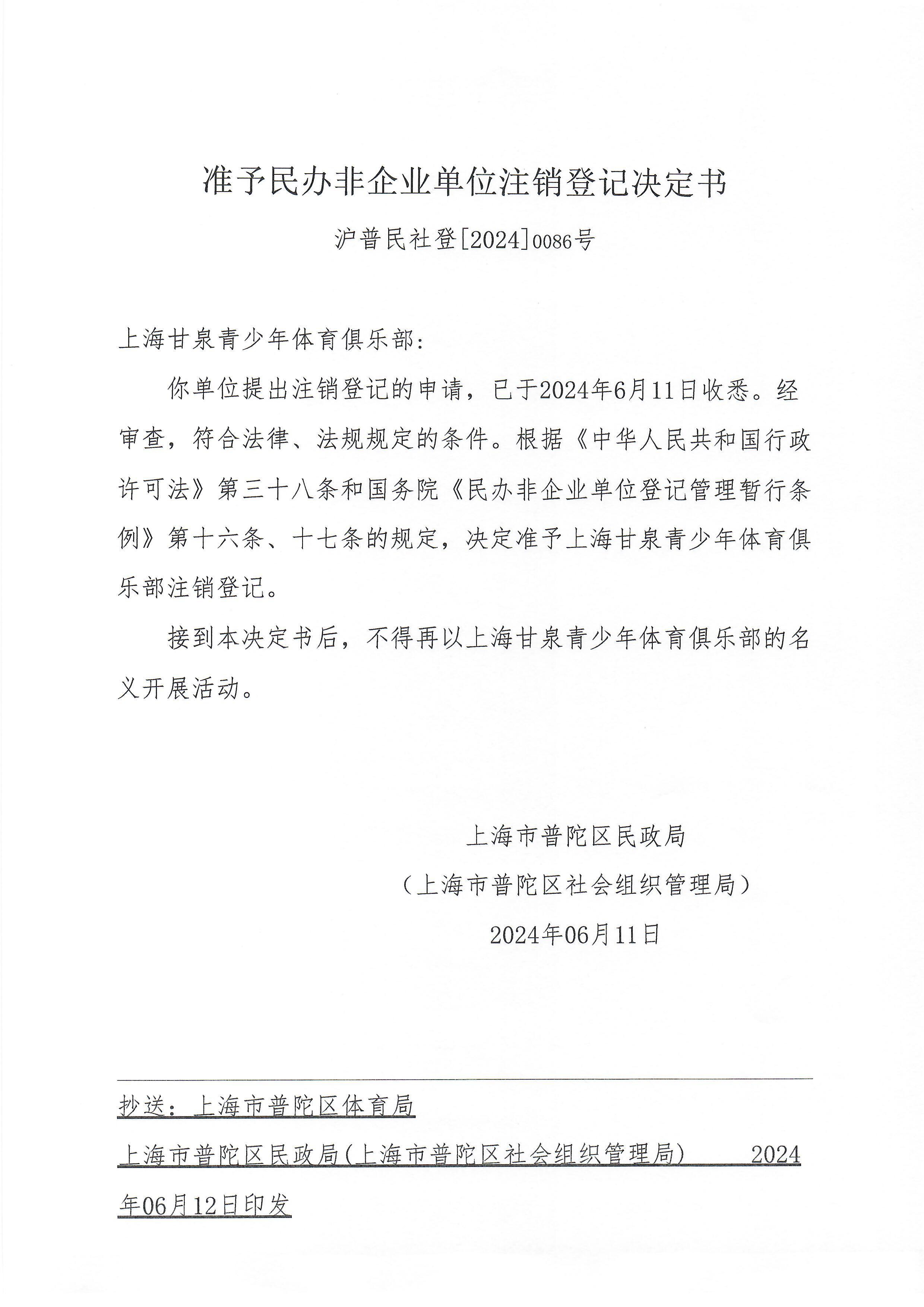 你单位提出注销登记的申请,已于2024年6月11日收悉。经审查,符合法律、法规规定的条件。根据《中华人民共和国行政许可法》第三十八条和国务院《民办非企业单位登记管理暂行条例》第十六条、十七条的规定,决定准予上海甘泉青少年体育俱乐部注销登记。