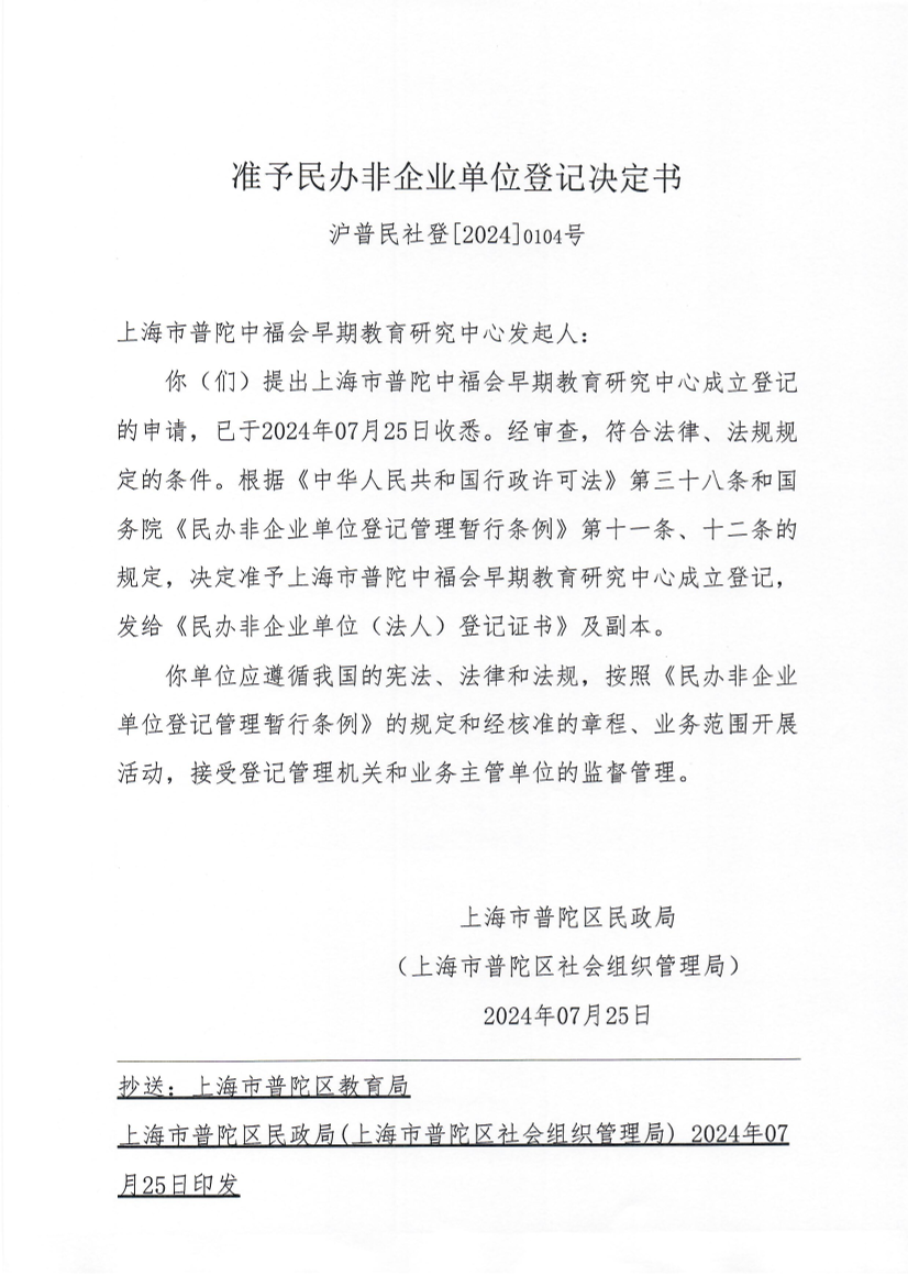 你(们)提出上海市普陀中福会早期教育研究中心成立登记的申请,已于2024年07月25日收悉。经审查,符合法律、法规规定的条件。根据《中华人民共和国行政许可法》第三十八条和国务院《民办非企业单位登记管理暂行条例》第十一条、十二条的规定,决定准予上海市普陀中福会早期教育研究中心成立登记,发给《民办非企业单位(法人)登记证书》及副本。