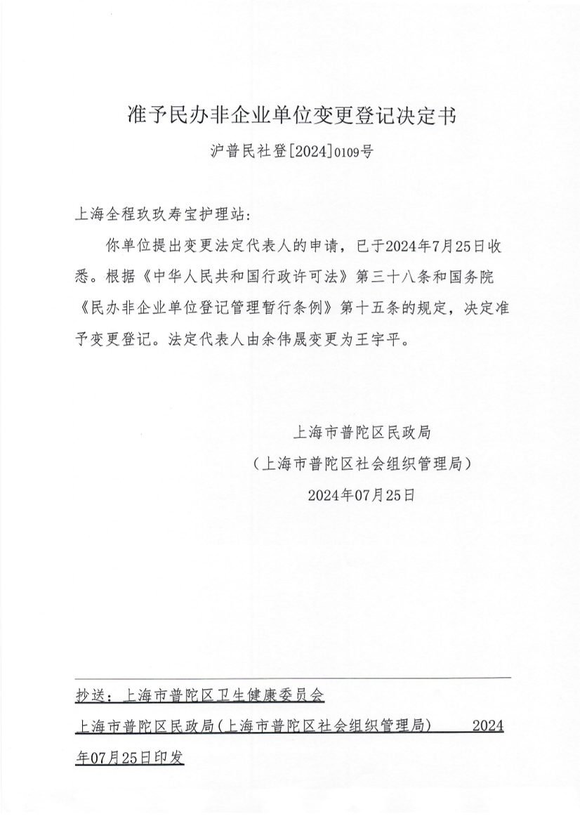 你单位提出变更法定代表人的申请,已于2024年7月25日收悉。根据《中华人民共和国行政许可法》第三十八条和国务院《民办非企业单位登记管理暂行条例》第十五条的规定,决定准予变更登记。法定代表人由余伟晟变更为王宇平。