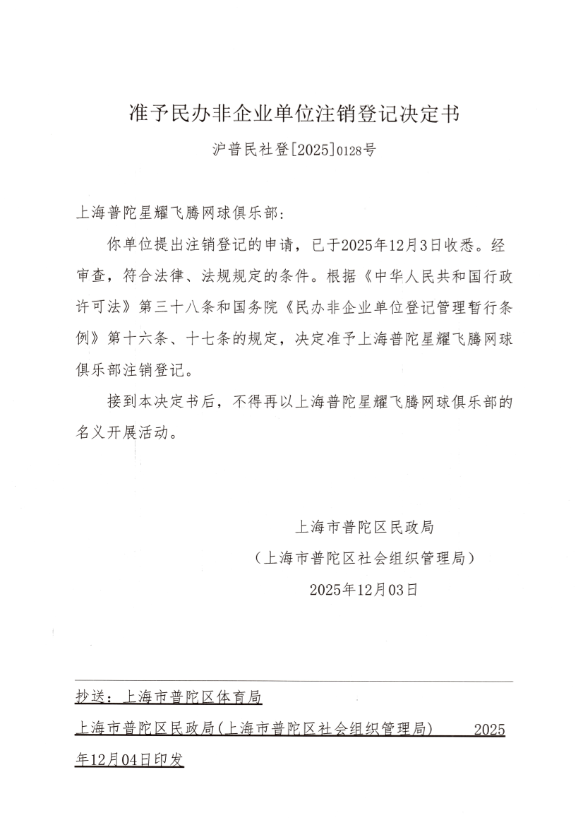 你单位提出注销登记的申请,已于2025年12月3日收悉。经审查,符合法律、法规规定的条件。根据《中华人民共和国行政许可法》第三十八条和国务院《民办非企业单位登记管理暂行条例》第十六条、十七条的规定,决定准予上海普陀星耀飞腾网球俱乐部注销登记。