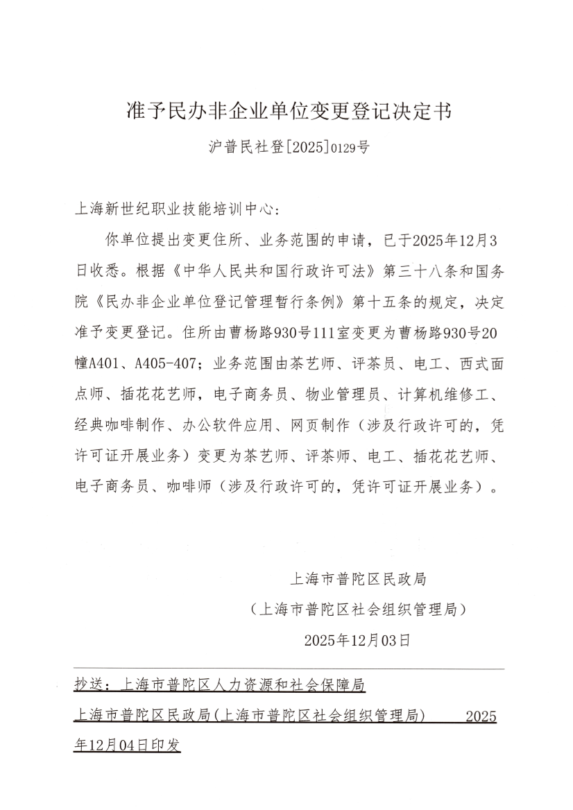 你单位提出变更住所、业务范围的申请,已于2025年12月3日收悉。根据《中华人民共和国行政许可法》第三十八条和国务院《民办非企业单位登记管理暂行条例》第十五条的规定,决定准予变更登记。住所由曹杨路930号111室变更为曹杨路930号20幢A401、A405-407;业务范围由茶艺师、评茶员、电工、西式面点师、插花花艺师,电子商务员、物业管理员、计算机维修工、经典咖啡制作、办公软件应用、网页制作(涉及行政许可的,凭许可证开展业务)变更为茶艺师、评茶师、电工、插花花艺师、电子商务员、咖啡师(涉及行政许可的,凭许可证开展业务)。